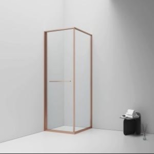 Optimaliseer elke centimeter van je badkamer met deze moderne, ruimtebesparende Inslide douchecabine met geborsteld koper profiel en helder veiligheidsglas.