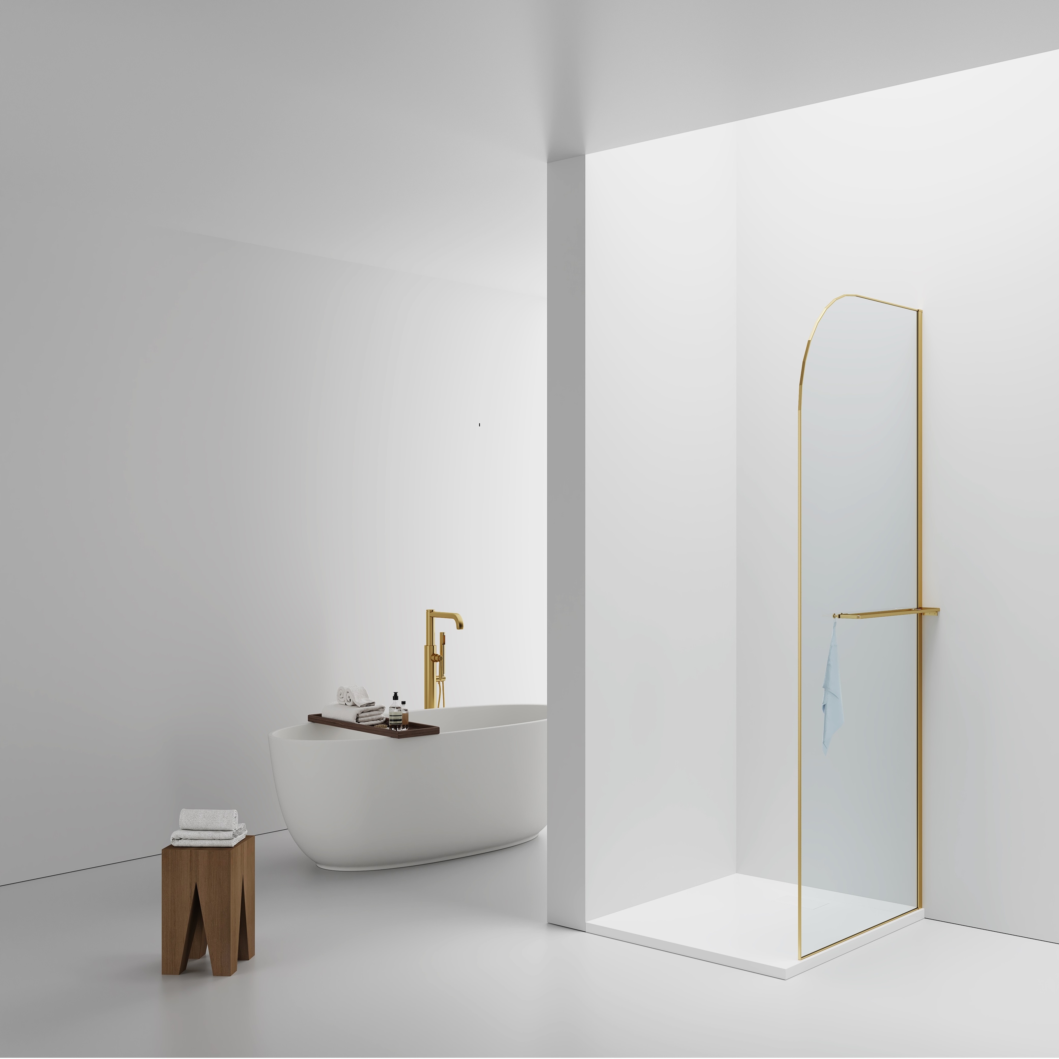 Breng een stijlvolle én comfortabele sfeer in je badkamer met de Curvy inloopdouche, uitgevoerd met een elegant goud profiel en helder veiligheidsglas.