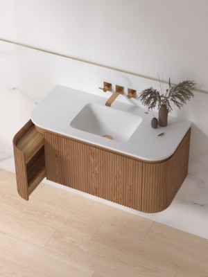 Dit meubel heeft een breedte van 100 cm en is gemaakt van gefineerd multiplex. De kast is waterdicht, dus ook geschikt voor in de badkamer. De acacia kleur geeft een mooi contrast met de witte wastafel. In de kast zijn lijnen gefreesd voor een ribbel effect, wat perfect past in de eigentijdse badkamer. Verder is de kast mooi afgewerkt met ronde hoeken. Zo kunt u zich niet aan een scherpe hoek stoten en het ziet het bovendien elegant uit! Ondanks de ronde hoeken bevat de kast maar liefst 3 laden, waardoor er optimaal gebruik gemaakt wordt van de ruimte.