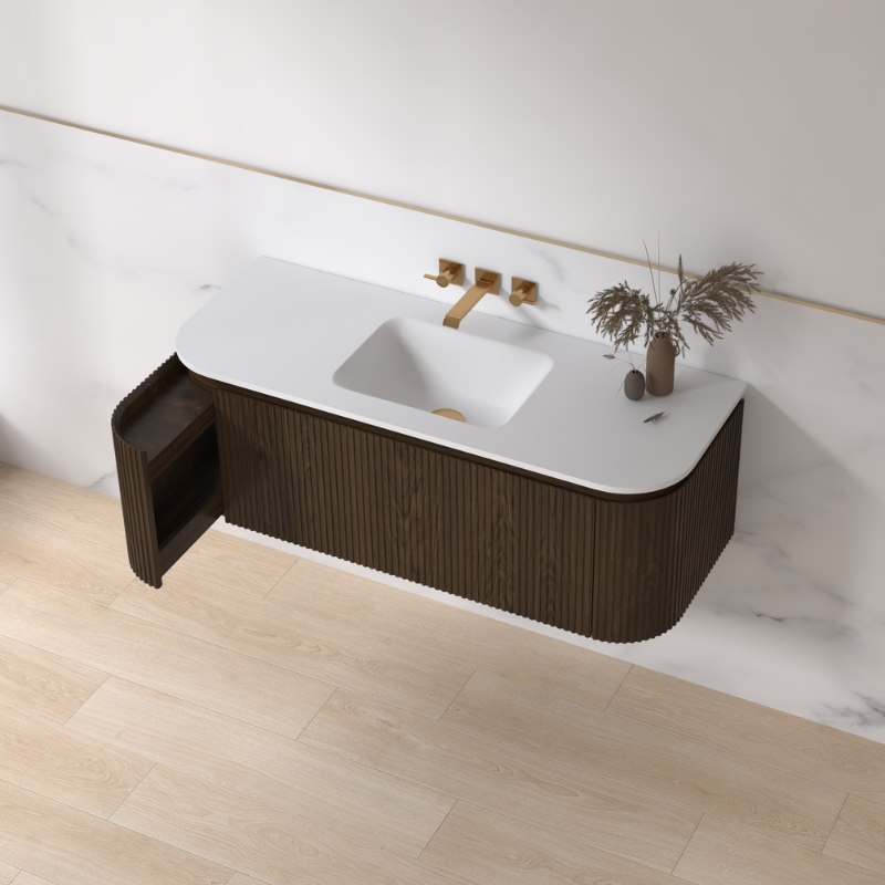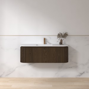 Dit meubel heeft een breedte van 80, 100 en 120 cm en is gemaakt van gefineerd multiplex. De kast is waterdicht, dus ook geschikt voor in de badkamer. De donkere walnoot kleur geeft een mooi contrast met de witte wastafel. In de kast zijn lijnen gefreesd voor een ribbel effect, wat perfect past in de eigentijdse badkamer. Verder is de kast mooi afgewerkt met ronde hoeken. Zo kunt u zich niet aan een scherpe hoek stoten en het ziet het bovendien elegant uit! Ondanks de ronde hoeken bevat de kast maar liefst 3 laden, waardoor er optimaal gebruik gemaakt wordt van de ruimte.